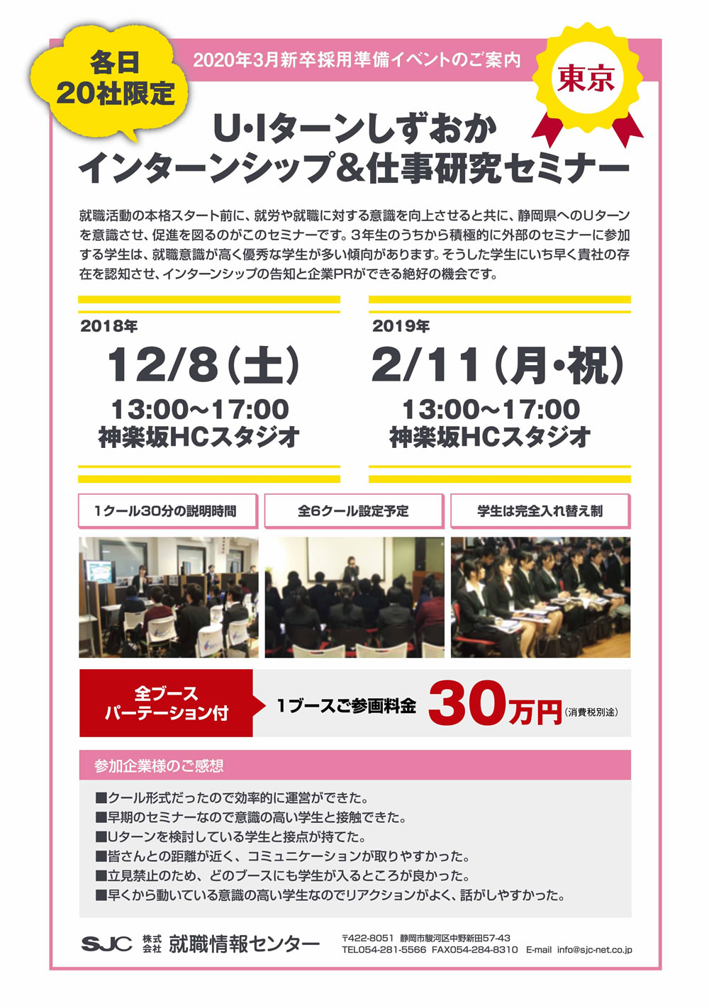 就職活動の本格スタート前に、就労や就職に対する意識を向上させると共に、静岡県へのUターンを意識させ、促進を図るのがこのセミナーです。3年生のうちから積極的に外部のセミナーに参加する学生は、就職意識が高く優秀な学生が多い傾向があります。そうした学生にいち早く貴社の存在を認知させ、インターンシップの告知と企業PRができる絶好の機会です。